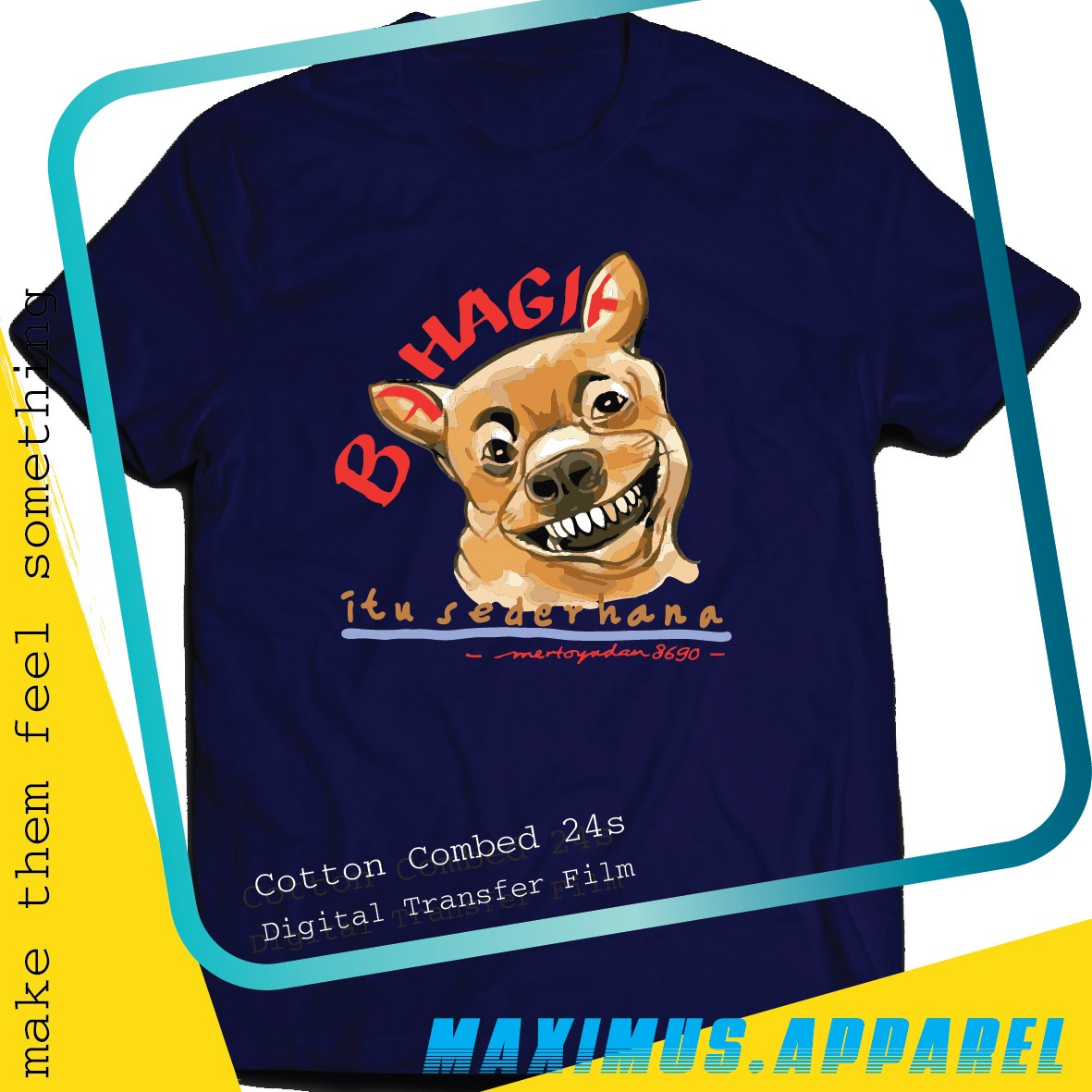 Melihat dan menikmati perilaku anak, teman, atau binatang piaraan yang lucu bisa membuat bahagia. Melihat unggahan media sosial yang lucu juga membuat kita bahagia. Pokoknya, bahagia itu sederhana seperti gambar anjing tersenyum yang saya buat di kaos itu. (Leo Wahyudi S)